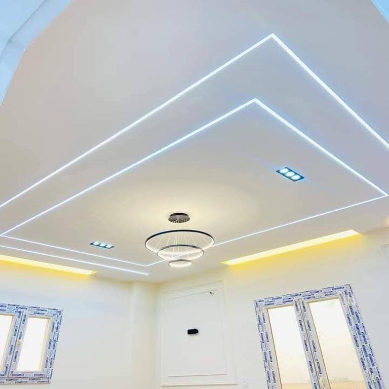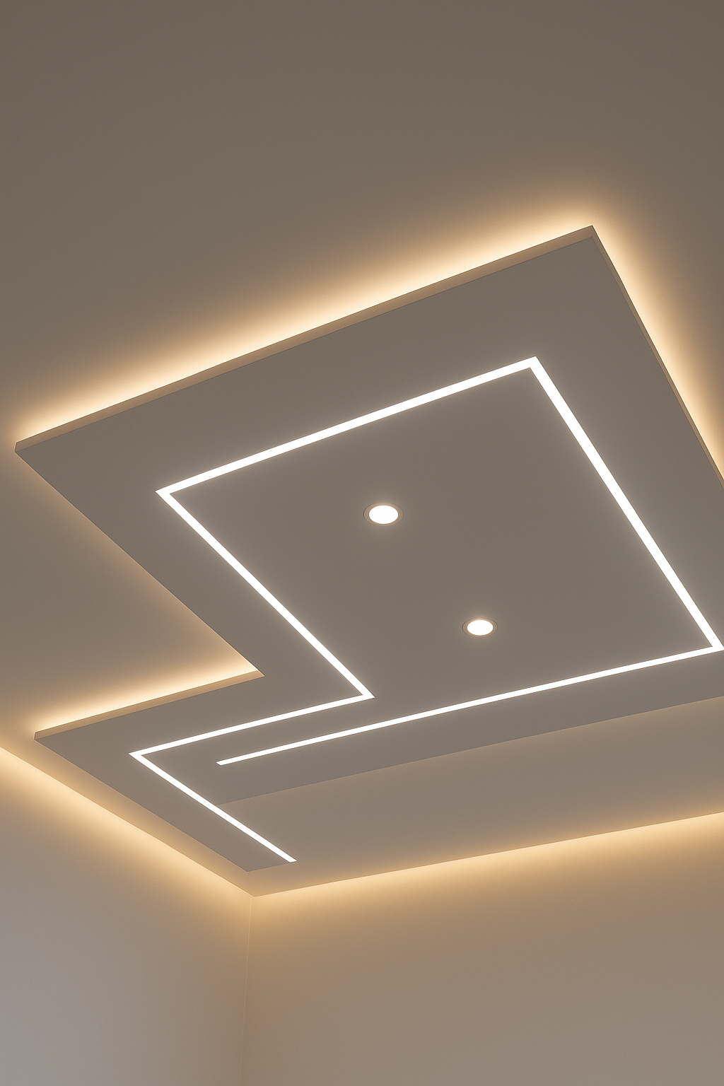 Modern gypsum ceiling with geometric LED strip design, offering a sleek and stylish look that enhances any interior space with contemporary elegance.