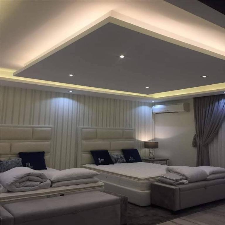 Elegant gypsum false ceiling with recessed spotlights, enhancing the bedroom with soft ambient lighting and a touch of modern luxury.